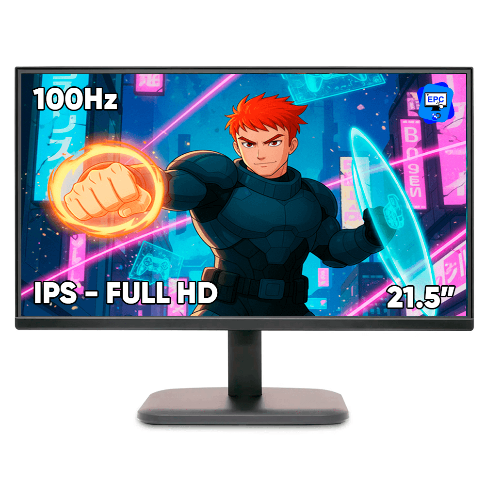 Un monitor de 21.5 pulgadas Full HD (1920×1080) con tecnología IPS y 100Hz generalmente tiene un tiempo de respuesta de 1ms o 4ms, un brillo de 250 nits y una relación de contraste de 3000:1. Incluye puertos HDMI y VGA y a menudo cuenta con tecnología AMD FreeSync, además de ser compatible con montaje VESA.