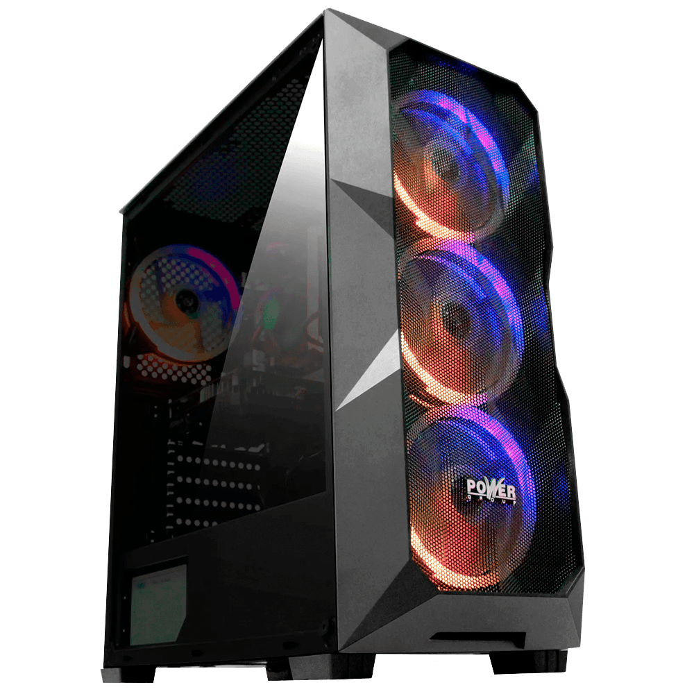 El chasis gamer Power Group L38 es una torre de alto rendimiento diseñada para placas base ATX y Micro-ATX, destacando por su estética con paneles de vidrio templado lateral, malla frontal con diseño de diamante y excelente ventilación. Incluye 4 ventiladores RGB preinstalados con controladora, malla frontal, y diseño de cámara independiente para la fuente de poder.